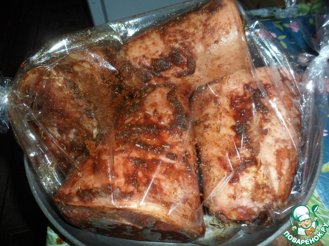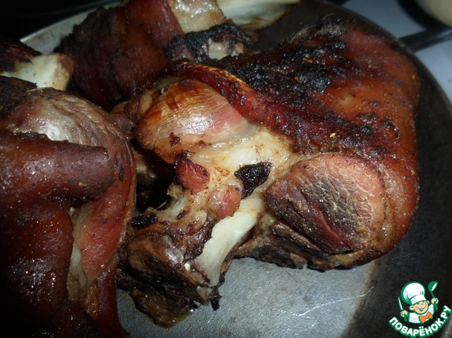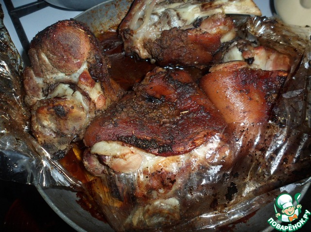 Отправляем духовку на 200 градусов до готовности (оголения косточек), смотрим по размеру и количеству рулек, у меня заняло два с половиной часа - рульки были крупные