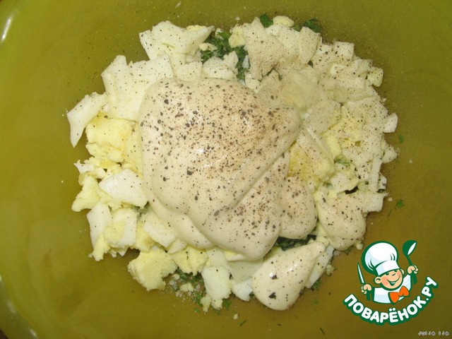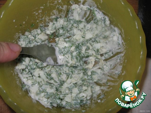 Разминаем всё это с майонезом. Я это делаю просто вилкой.