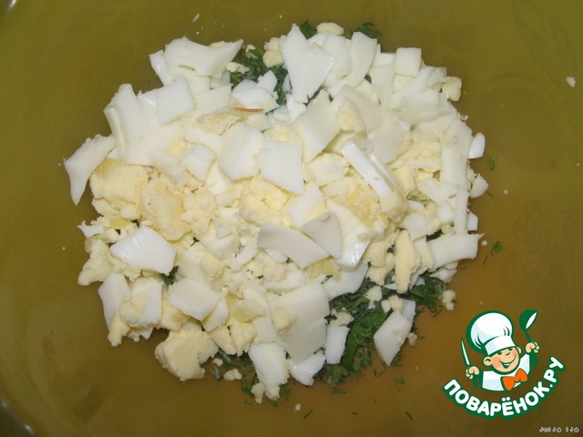 Добавляем измельчённый чеснок, совсем немного. Кто боится с утра есть чеснок - можно обойтись без него. Солим, перчим - по вкусу.