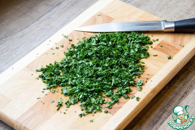 Зелень петрушки моем, сушим, отрезаем все жесткие стебли и мелко-мелко рубим ножом. Удобнее всего рубить зелень если поставить острый конец ножа на доску и не отрывая его, поднимая лишь рукоять резать в разные стороны.