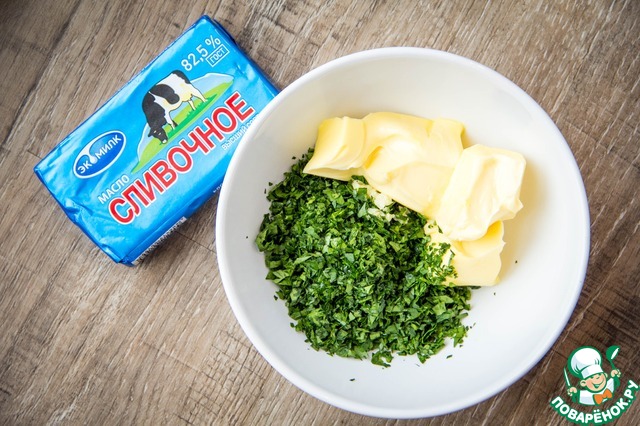Масло необходимо заранее достать из холодильника, чтобы оно стало комнатной температуры, мягким. Немного зелени отложить, остальную насыпать в миску. Добавить в миску сливочное масло, лимонный сок и зубчик чеснока, выдавленные через пресс. Чеснока можно взять больше или меньше, по вкусу. Или не класть вовсе. Но я все же советую хоть немного его добавить, он придает изюминку