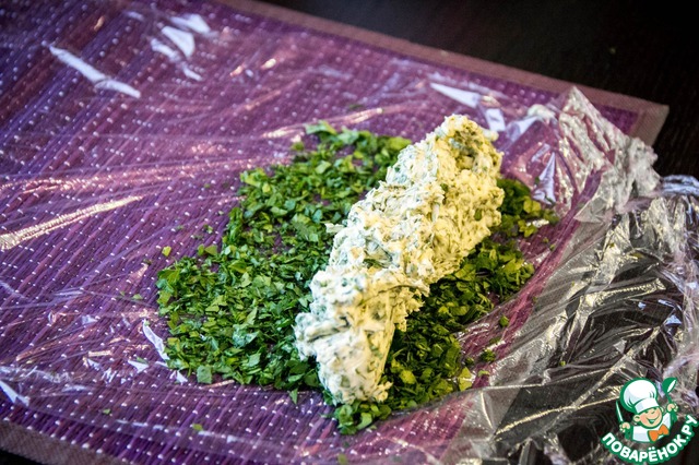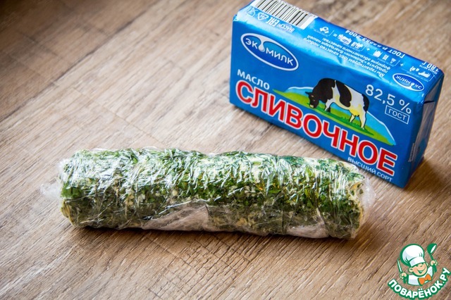 Теперь необходимо свернуть масло в брусок. Очень удобно это делать при помощи коврика для закручивания роллов или чего-то подобного. Если ничего подходящего нет, не страшно. На пищевую пленку равномерно положите оставшуюся порубленную зелень, на край выложите масло и заверните.