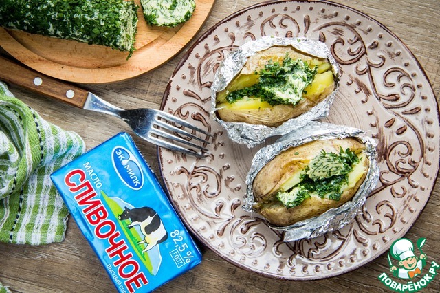 Картофель достать их духовки надрезать и положить по нескольку кругляшков зеленого масла в разрез каждого клубня пока он горячий. Скорее подавать к столу!