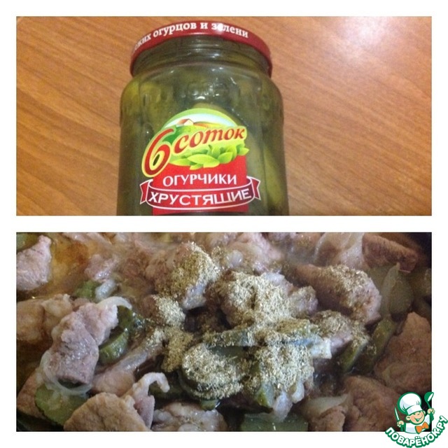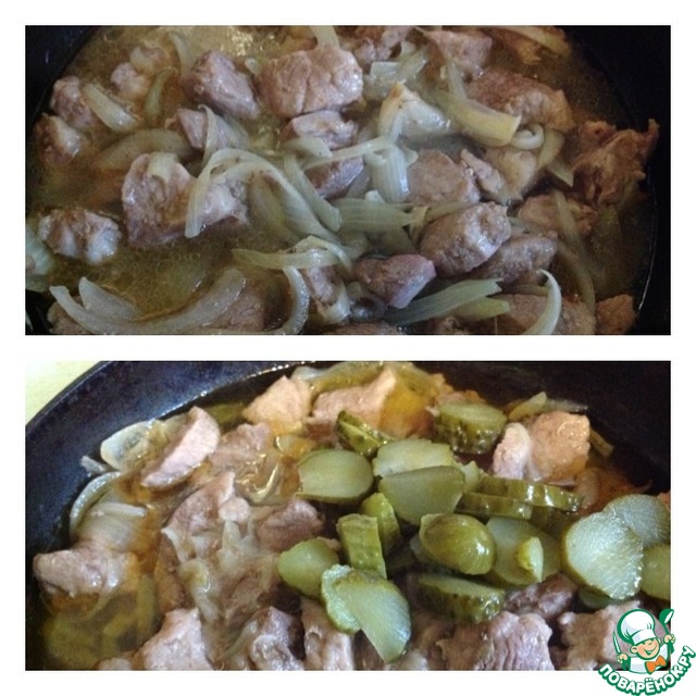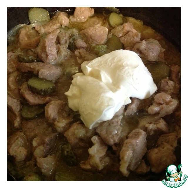 Влить воду, огонь убавить на минимум. Перемешать и закрыть крышкой. Тушить на медленном огне не менее 50 минут. Спустя данное время, добавить к мясу огурцы нарезанные кружочками. Перемешать и оставить еще на 10 минут.