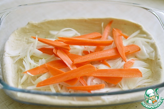 Лук и морковь почистить, нарезать произвольно. Выложить на тесто.