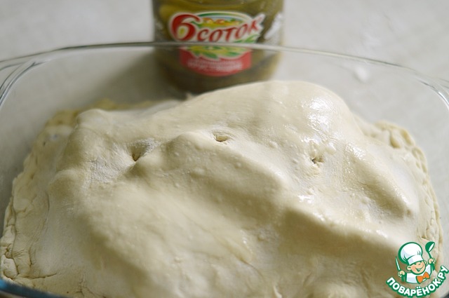 Тесто разделить на 2 части- 300 и 200г. Из большей части раскатать прямоугольник, толщиной примерно 0.5 см, выложить в жаропрочную форму, формируя бортики.