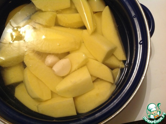 Приготовить картофельное пюре. Для этого картофель помыть, очистить, нарезать ломтиками, чеснок очистить. В кастрюлю добавить картофель, целые зубки чеснока и сварить до готовности в подсоленной воде. Воду слить, добавить горячее молоко или сливки, сливочное масло и приготовить пюре.