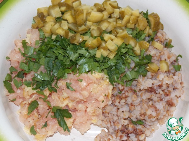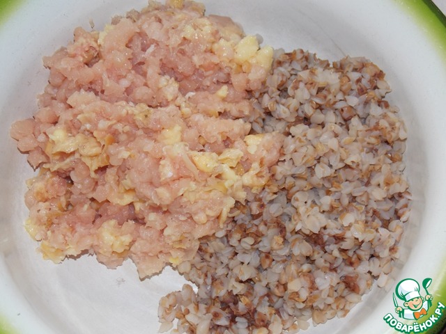 В миску выложить фарш (у меня домашний), добавить отварную гречневую крупу.