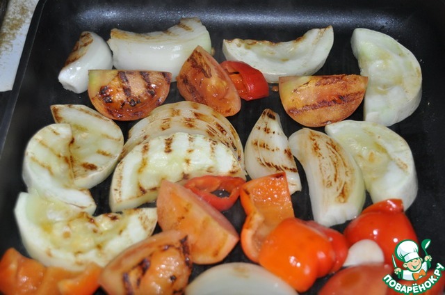 Обжариваем овощи на сковороде-гриль до полу-готовности (красивых полосочек).