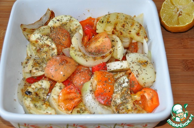 Кладём овощи в форму для запекания, солим, посыпаем свежим или сушёным базиликом, поливаем соком лимона.