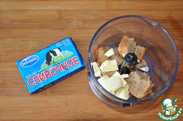 В измельчитель (блендер) кладём кусочки хлеба и масла, измельчаем в жирную крошку.