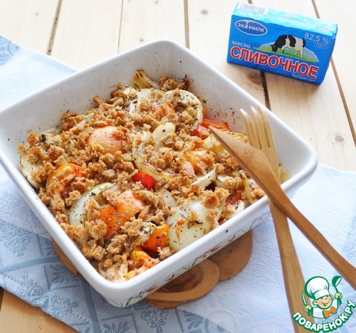 Посыпаем овощи масляно-хлебной крошкой, ставим в духовку и запекаем при 220 градусах около 20 минут до подрумянивания хлебных крошек.