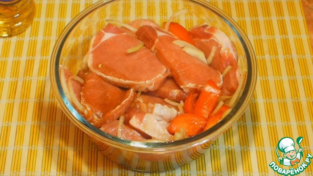 Нарезанную свинину заливаем соевым соусом, добавляем помидоры. лук.