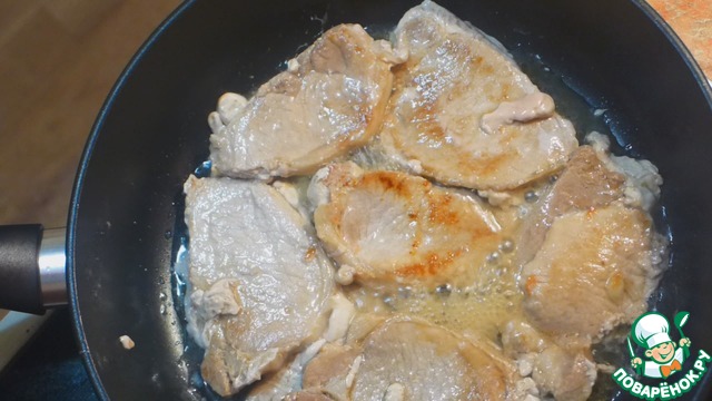 Обжариваем каждый замаринованный кусочек мяса на растительном масле с двух сторон до золотистого цвета