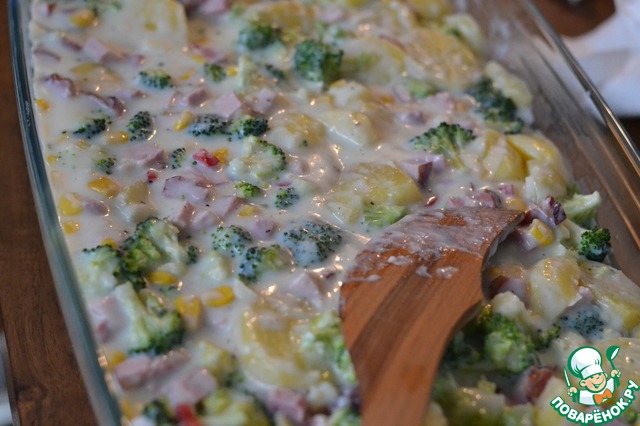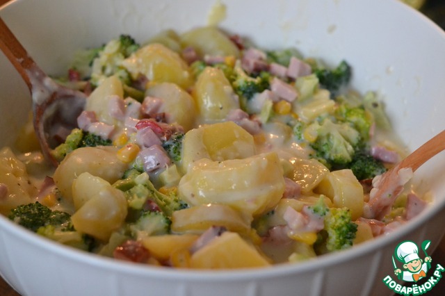 В большой миске смешать нарезанный картофель, брокколи, ветчину, кукурузу и половину твердого сыра.