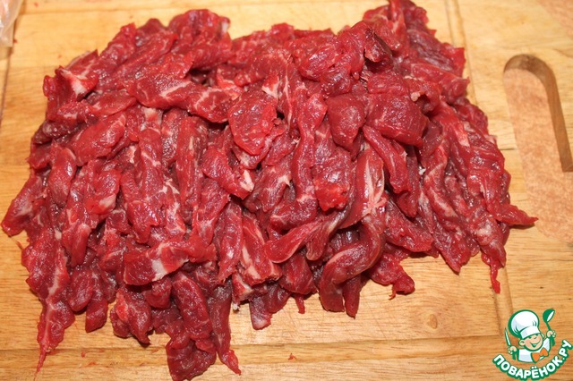 Теперь приступим к мясу. Нарежем говяжью вырезку тонкими ломтиками.