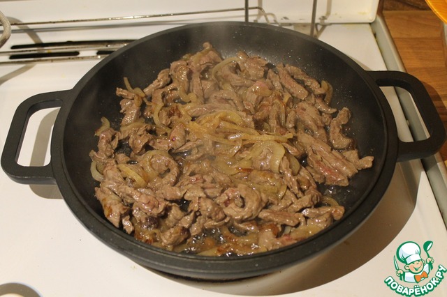 Треть лука отправляем в соус, остальной оставим на сковороде. На сковороду добавляем еще немного растительного масла (1 ст. л.) и на сильном нагреве обжариваем вырезку на луке.