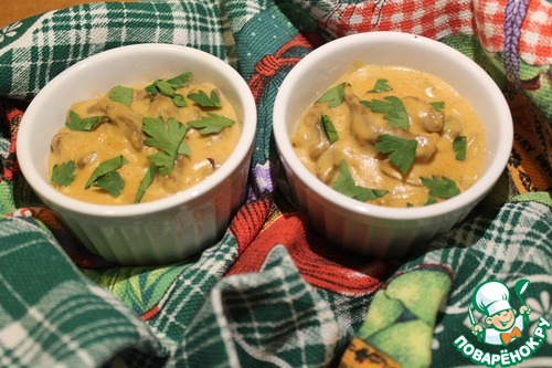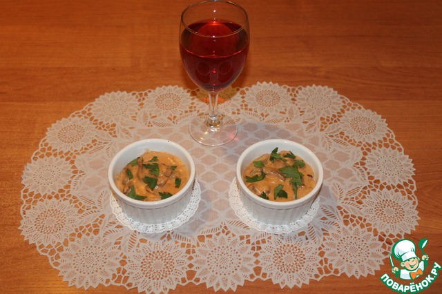 Опускаем мясо в соус и прогреваем на водяной бане или на самом слабом огне 3-4 минуты. Подаем порционно в маленьких формочках, посыпав зеленью петрушки (ее можно нарезать ножницами прямо в формы).