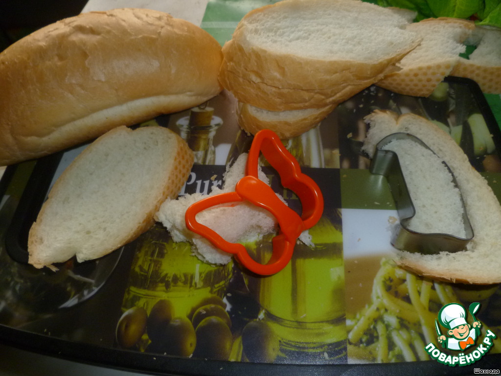 Вырежем из булочки фигурки в виде животных, используя при этом несколько различных формочек для печенья.