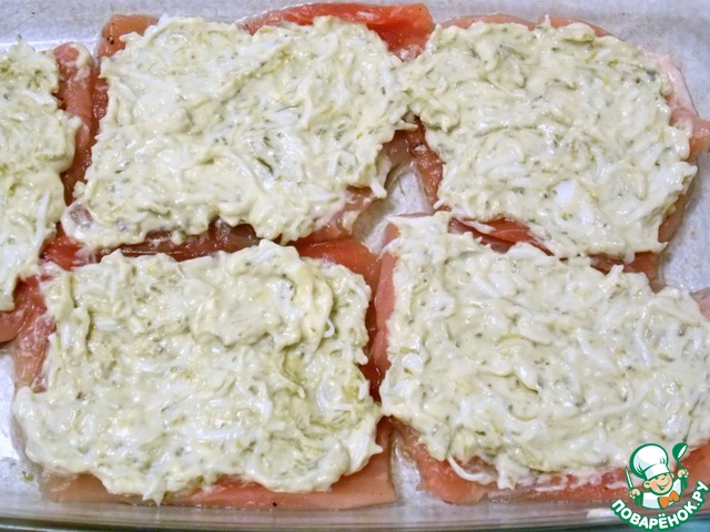 Положить остальные куски, по одному наверх начинки и прижать немного мясо по краям. Намазать верх майонезом. Налить немного воды в форму.