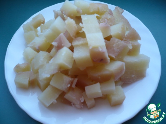 Картофель помыть и отварить в мундире до готовности. Дать остыть. Затем нарезать картофель мелкими кубиками.
