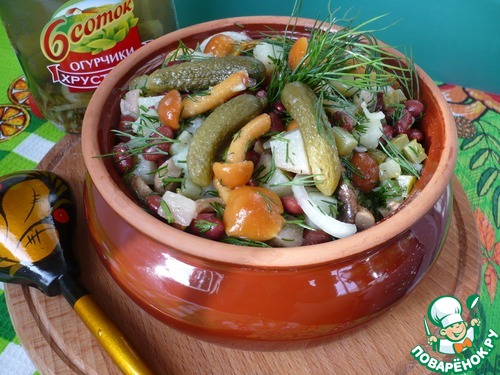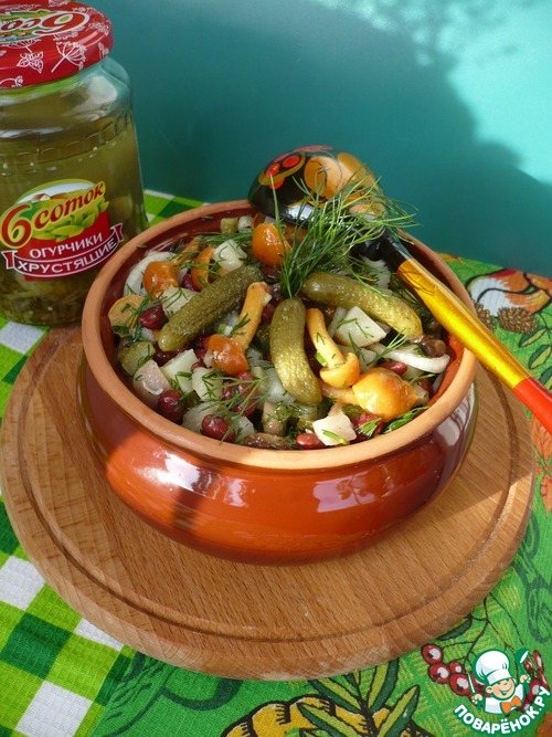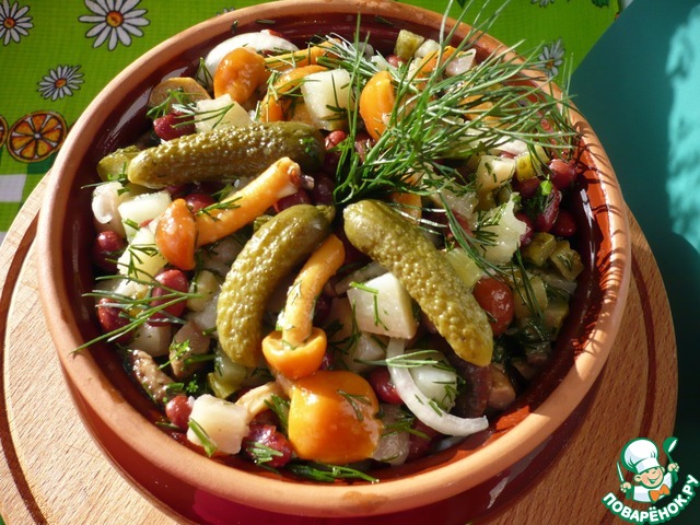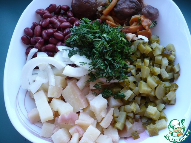 Соединим в миске картофель, маринованные огурчики, фасоль и грибочки, добавим нарезанный полукольцами лук и измельчённый укроп. Посолить, поперчить по вкусу и перемешать. Заправить салат растительным маслом.