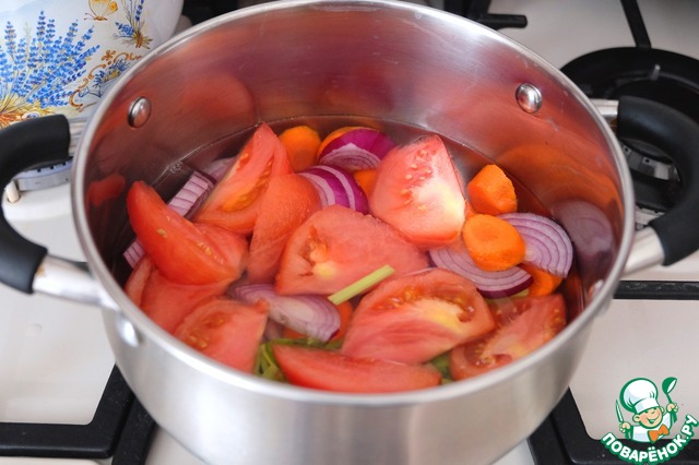 Помидоры обдать кипятком, удалить кожицу, порезать кусочками. Репчатый лук, черешковый сельдерей, морковь порезать кусочками. Добавить все составляющие супа в кастрюлю, добавить воду. Вода должна слегка покрывать овощи. Тушить овощи до мягкости. Добавить по вкусу соль и черный молотый перец, в конце тушения добавить томатную пасту (1 ч. ложка)