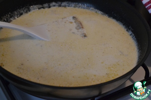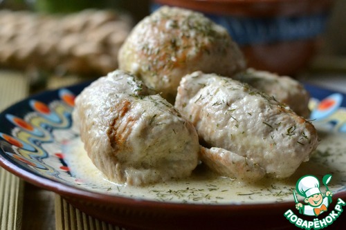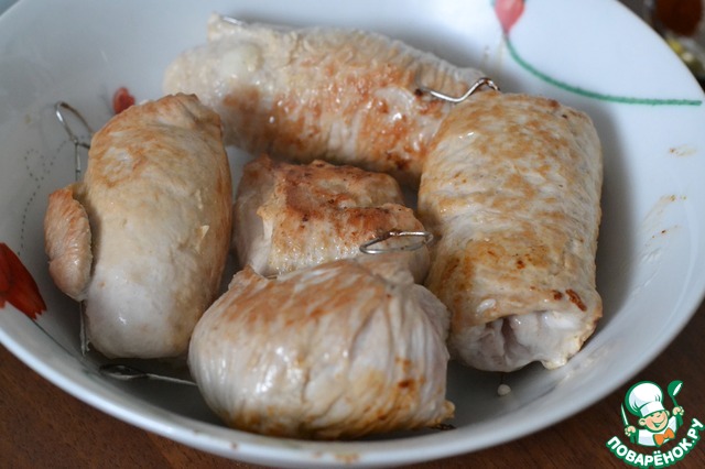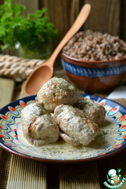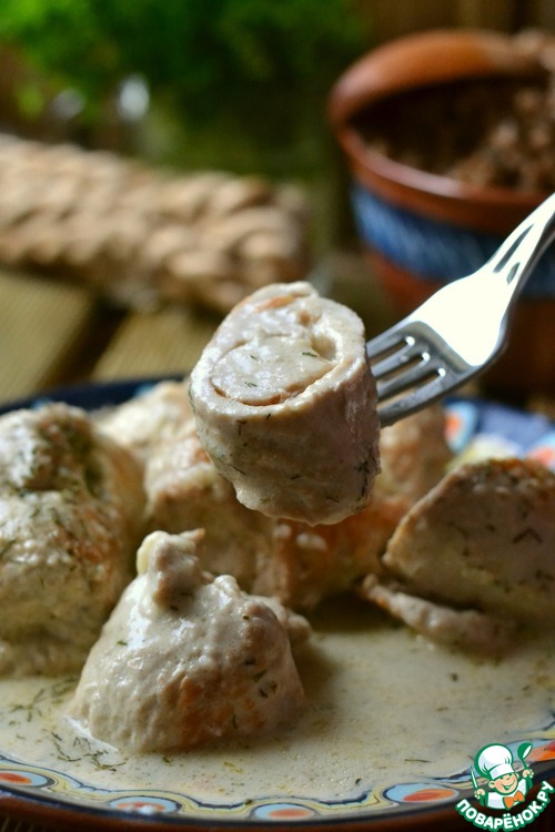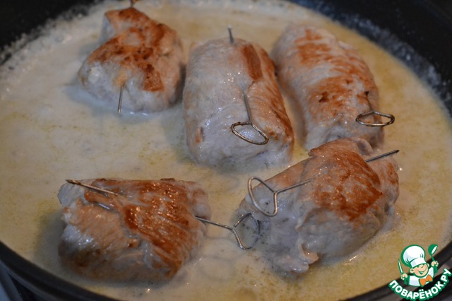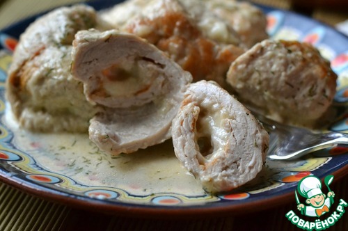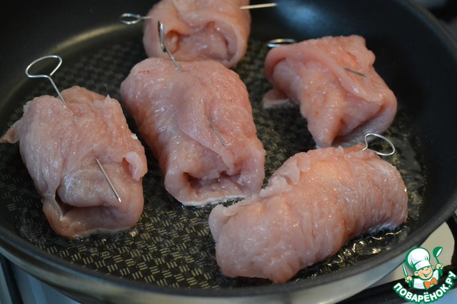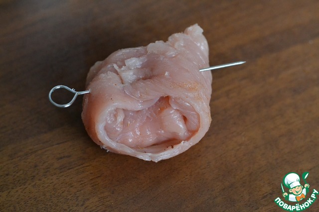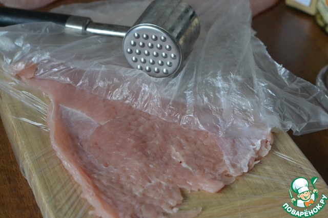 Свернуть отбивную конвертиком, чтобы моцарелла не вытекла.
