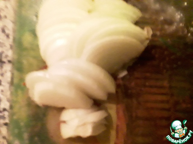 Пока печень жарится чистим лук и нарезаем его полукольцами