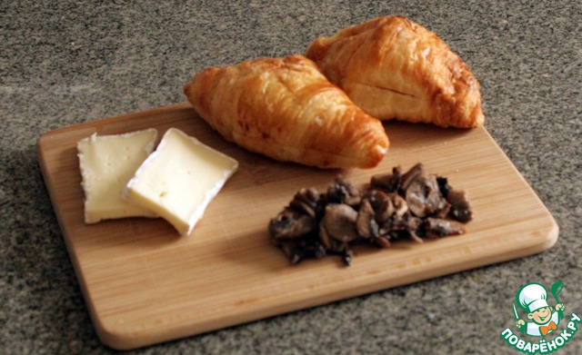 Грибы пожарить без масла, если с маслом, то разложить на бумажное полотенце. Сыр порезать пластинками, круассаны надрезать.