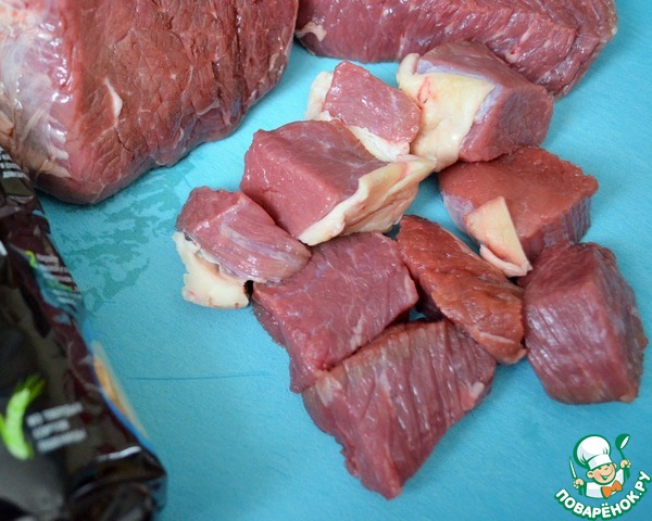 Говядину нарезать на квадраты, 3-4 см..