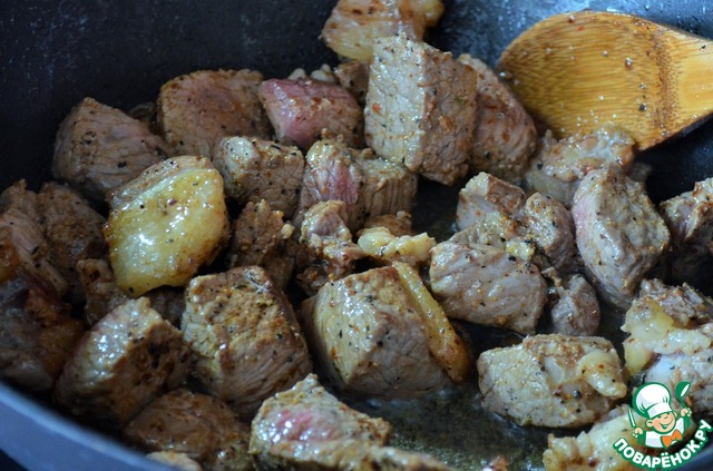и обжарить на сильном огне мясо, до румяных бочков.
