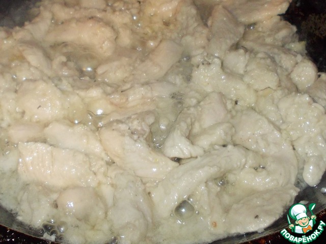 Через полторы минуты крышку снимаем. Филе переворачиваем (собственно сказать перемешиваем). Видим, что многие кусочки уже побелели. Накрываем снова крышкой.