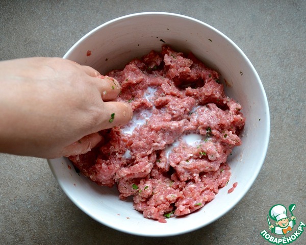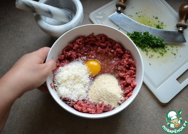 Подготовить фарш из телятины и свинины. В миске смешать оба вида фарша, яйцо, семолину, тертый сыр пармезан. Перемешать рукой до соединения всех ингредиентов.