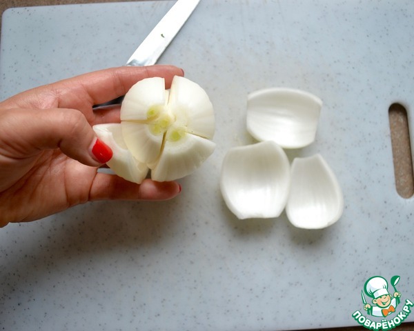Луковицу вымыть и очистить от верхнего слоя шелухи. Сделать четыре глубоких надреза в луковице и отделить по одной получившиеся четвертинки луковых "лепестков"))) В зависимости от размера луковицы, для рецепта может потребоваться чуть более одной луковицы.