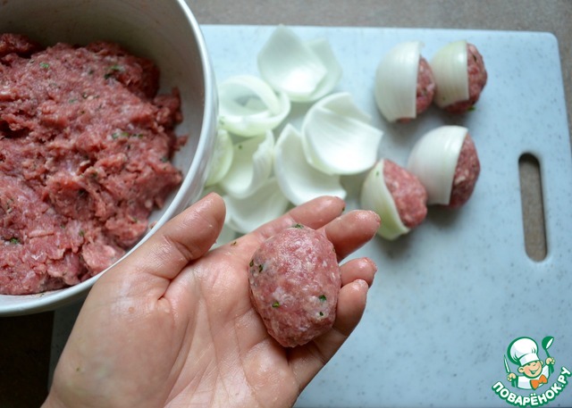 Подготовить глубокое блюдо с холодной водой. Руки смачивать слегка в воде и формировать тефтели размером с небольшое яйцо. Фактически, тефтели должны соответствовать размеру приготовленных "скорлупок" из луковицы... Поэтому в более маленькие луковые "скорлупки" (те, что из центра луковицы) войдут тефтели чуть меньшего размера. В итоге, половинка каждой тефтели разместится в луковой "скорлупке".