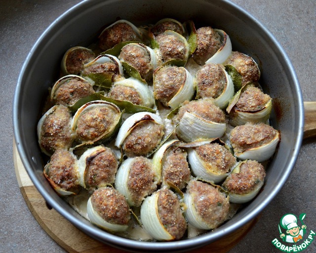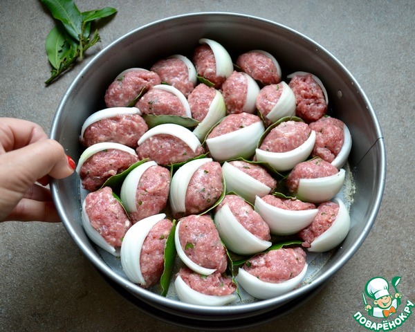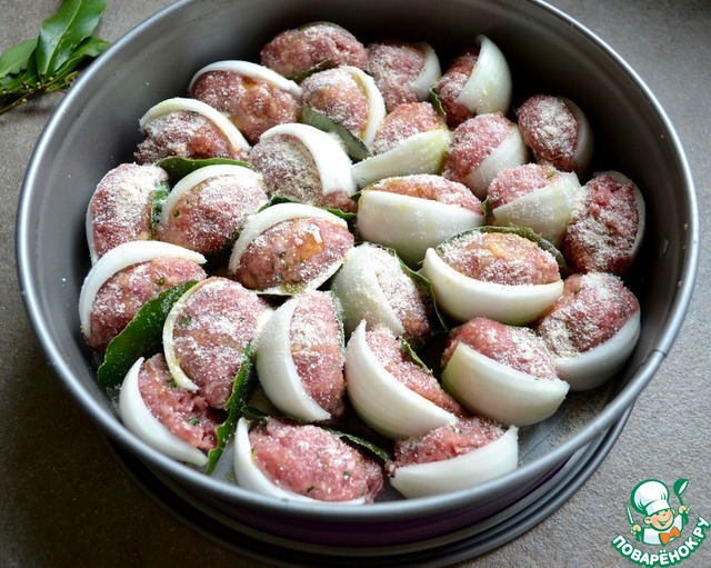 ... заполнив таким образом всю форму тефтелями в "луково-лавровой рубашке".