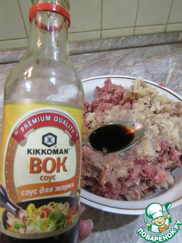 К нашему фаршу добавляем яйцо, соевый соус, устричный соус. Фарш вымешиваем. На мой вкус хватило соли, содержащейся в соусах, но если вам покажется несоленым - добавьте соли.
