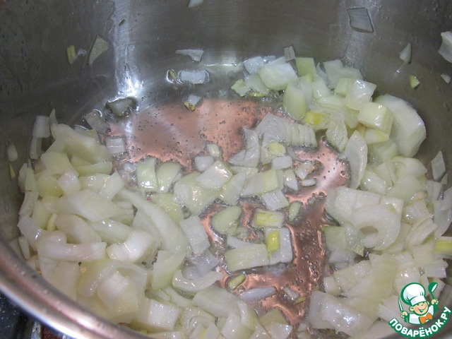 Пока идет усердная лепка пельменей, начинаем готовить суп. Обжариваем на растительном масле порезанный крупными кубиками лук.