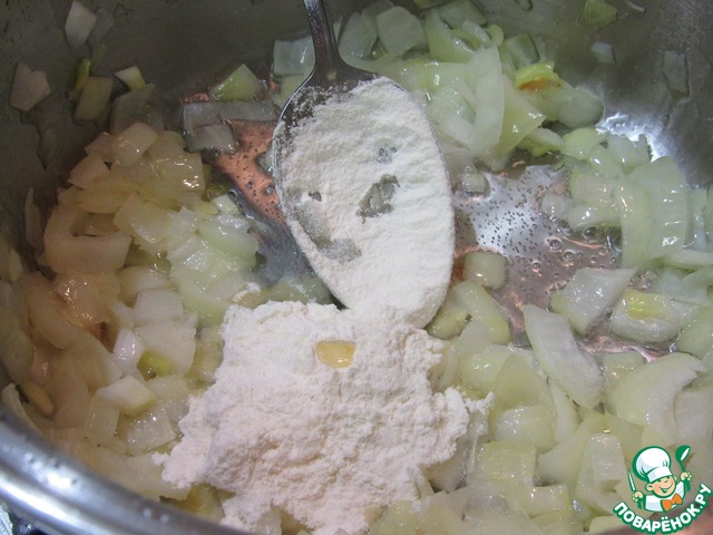 Добавляем муку и так же обжариваем до золотистого цвета.