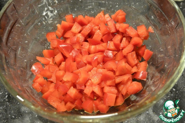 Для начала, очистите от семян и плодоножек перец, удалите белые перегородки. Нарежьте перец очень мелкими кубиками.