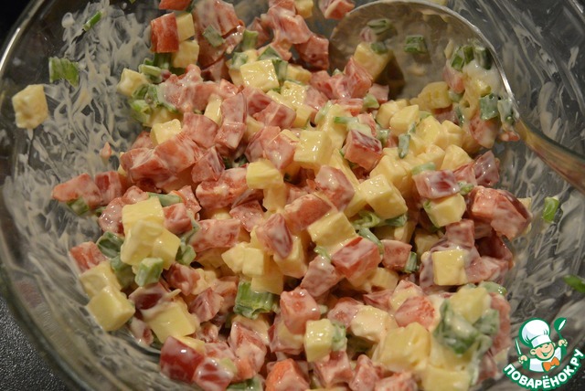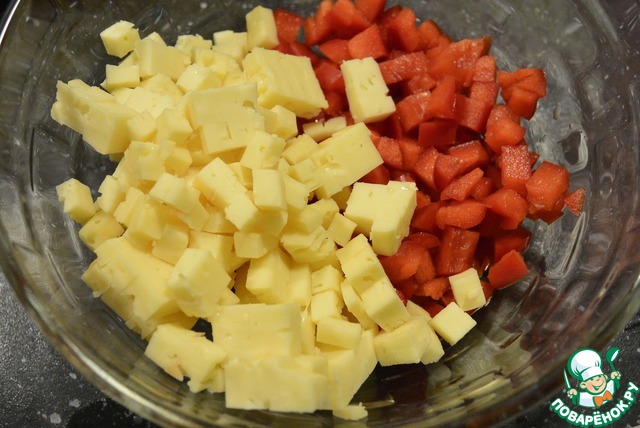 Затем такими же кубиками нарежьте сыр и добавьте к перцу.