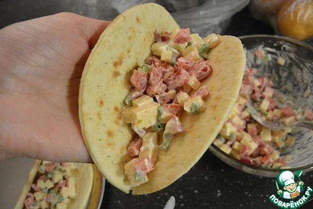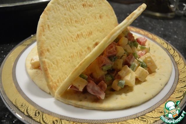 Возьмите лепешки, питу или кусок лаваша. Я использую сметанные ладушки, как на фото. Они не слишком толстые, мягкие и держат форму.