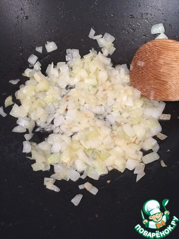 На разогретую сковороду наливаем растительное масло, добавляем мелко порезанный лук и пассируем до мягкости.