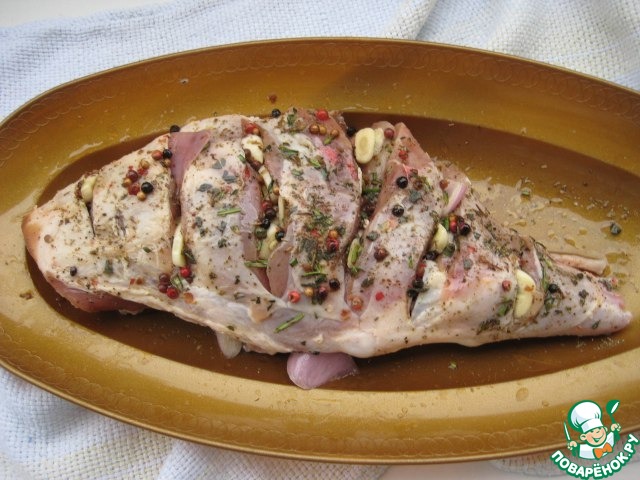 Мясо необходимо накануне замариновать. Чеснок и лук почистить, порезать пластинками чеснок, лук на две части, на мясе сделать надрезы, нашпиговать чесноком, смазать оливковым (или растительным маслом без запаха), посыпать смесью перцев, посыпать розмарином. Накрыть пищевой пленкой и убрать в холодильник на ночь. На следующий день мясо посолить, положить в форму для запекания, влить на дно вино и воду. Выпекать при температуре 170 градусов 1,5-2 часа до мягкости мяса. При выпекании мясо пару раз перевернуть и полить соком со дна формы.