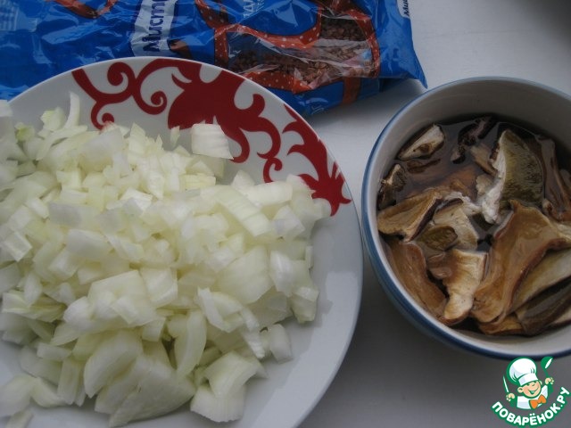 Белые сухие грибы замочить в кипятке, достать, мелко порезать. Большую луковицу почистить, порезать кубиком. Настой от грибов отстоять.