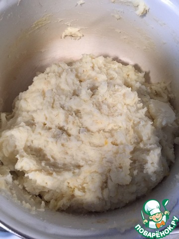 В остывшее картофельное пюре добавляем яйцо, муку и 3-4 горсти тертого сыра и хорошо перемешиваем. Получается слегка липкое тесто.