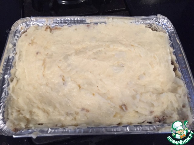Сверху него начинку из печени и накрыть оставшимся картофельным тестом