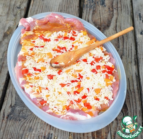 Равномерно распределите начинку по всей поверхности мяса. Придавите её к мясу ладошкой или лопаткой.