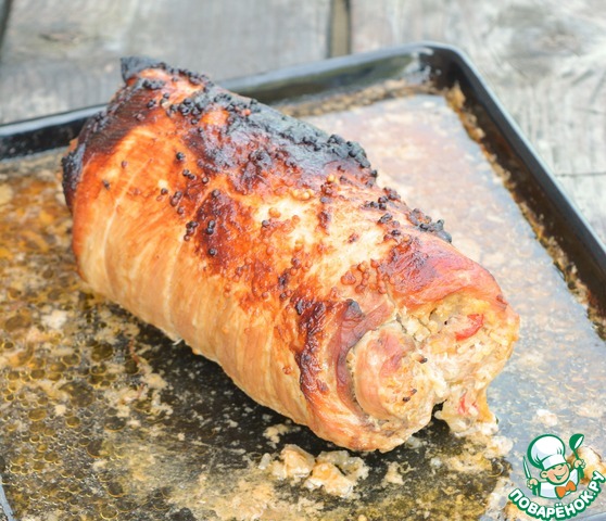 Нагрейте духовку до 160 градусов. Запекайте около 1-1,5 часов, желательно с конвекцией. На противень, на котором запекается рулет постоянно подливайте горячую воду, чтобы на поверхности противня было воды не менее 0,5 см. Периодически поливайте рулет образовавшимся соком.
